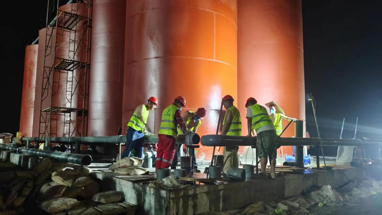 經過一個月的埋頭苦干,克服了地基基礎薄弱、各類工藝管線設備錯綜復雜、“0804”電白區疫情突發事件、第9號臺風“馬鞍”過境等諸多難題,保證了節點工期,并于8月30日晚22時49分實現罐體試進水,8月31日下午18時22分實現生產調試通水,順利完成9月1日前全面完成生產通水的目標。