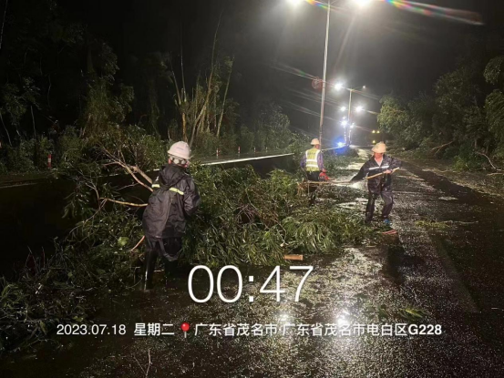 “大家做好安全措施,立即前往228國道做好道路排險工作。”集團道路養(yǎng)護負責人,迅速組織養(yǎng)護人員連夜頂風“逆行”,冒雨出動,迅速開展清障保通工作,以最快速度對倒扶、斷枝、傾斜等樹木進行清理,保障養(yǎng)護路段交通安全、有序、暢通。