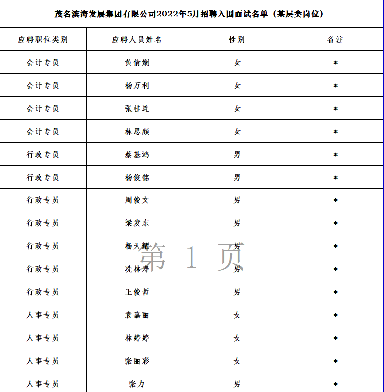 茂名濱海發展集團有限公司2022年5月招聘擬入圍體檢名單公示