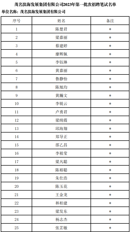 茂名濱海發展集團有限公司2023年第一批次招聘筆試名單公示